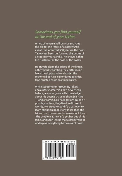 Sometimes you find yourself at the end of your tether. A ring of reverse half gravity encircles the globe, the result of a cataclysmic event that occurred 500 years in the past. Tallow has been performing the duties of a scout for years and all he knows is that life is difficult at the base of the swath. He travels along the edges of the limen, a threshold separating the earth-bound from the sky-bound - a border the tether tribes have never dared to cross. One misstep could cost him his life. While scouting for resources, Tallow encounters something he's never seen before, a woman, one with knowledge about his people that she shouldn't have - and a warning. Her allegations couldn't possibly be true, they lived in different worlds. Her people couldn't cross over to learn about his people any more than the tribes could cross over to learn about hers. The problem is, he can't get her out of his mind, and soon learns that a dangerous lie underpins everything he has ever known.