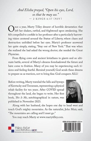 And Elisha prayed, "Open his eyes, Lord, so that he may see." - 2 KINGS 6:17 (NIV) Once a year, Marty Tilley dreamt of horrible devastation that left her shaken, rattled, and frightened upon awakening. She felt compelled to confide in her professor after a particularly harrowing vision centered around the Statue of Liberty, where chaos and destruction unfolded before her eyes. Marty's professor answered her quite simply, stating, "Stay out of New York." That was when she realized she had asked the wrong doctor; she needed the Great Physician. From flying cows and ancient leviathans to giants and an ulti- mate battle, several of Marty's dreams foreshadowed the future and have come to fruition. Many of you may be experiencing such vi- sions and feeling fearful. Remind yourself, God sends these dreams to prepare us as warriors, not to bring fear. God conquers ALL!