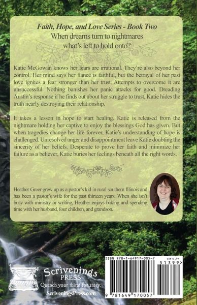When dreams turn to nightmares what's left to hold onto? Katie McGowan knows her fears are irrational. They're also beyond her control. Her mind says her fiancé is faithful, but the betrayal of her past love ignites a fear stronger than her trust. Attempts to overcome it are unsuccessful. Nothing banishes her panic attacks for good. Dreading Austin's response if he finds out about her struggle to trust, Katie hides the truth nearly destroying their relationship. It takes a lesson in hope to start healing. Katie is released from the nightmare holding her captive to enjoy the blessings God has given. But when tragedies change her life forever, Katie's understanding of hope is challenged. Unresolved anger and disappointment leave Katie doubting the sincerity of her beliefs. Desperate to prove her faith and minimize her failure as a believer, Katie buries her feelings beneath all the right words. When she's faced with losing everything, will Katie abandon her hope or cling to the lifeline God has given?