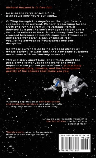 Richard Hazzard is in free fall. He is on the verge of something. If he could only figure out what... Drifting through Los Angeles on the night he was supposed to be married, Richard is searching for the truth and running from it. He remains Hamlet-haunted by a past he can't manage to forget and a future he refuses to face. From smokey beaches to crowded barrooms to hillside mansions, Richard is an unmoored wanderer, alone, unsure-of-foot, vacillating between self-awareness and self-deception. On whose current is he being dragged along? By whose design? To what end? And how come questions never meet with satisfactory answers? This is a story about time, and timing. About the people who tether you to the world and what happens when you cut yourself loose. It is a story about uncertainty, identity, and the inescapable gravity of the choices that make you you.