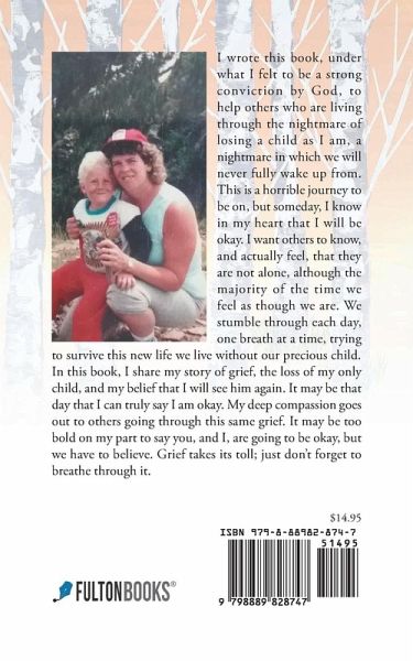 I wrote this book, under what I felt to be a strong conviction by God, to help others who are living through the nightmare of losing a child as I am, a nightmare in which we will never fully wake up from. This is a horrible journey to be on, but someday, I know in my heart that I will be okay. I want others to know, and actually feel, that they are not alone, although the majority of the time we feel as though we are. We stumble through each day, one breath at a time, trying to survive this new life we live without our precious child. In this book, I share my story of grief, the loss of my only child, and my belief that I will see him again. It may be that day that I can truly say I am okay. My deep compassion goes out to others going through this same grief. It may be too bold on my part to say you, and I, are going to be okay, but we have to believe. Grief takes its toll; just don't forget to breathe through it.