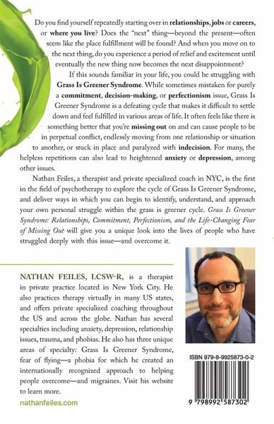 Do you find yourself repeatedly starting over in relationships, jobs or careers, or where you live? Does the "next" thing-beyond the present-often seem like the place fulfillment will be found? And when you move on to the next thing, do you experience a period of relief and excitement until eventually the new thing now becomes the next disappointment? If this sounds familiar in your life, you could be struggling with Grass Is Greener Syndrome. While sometimes mistaken for purely a commitment, decision-making, or perfectionism issue, Grass Is Greener Syndrome is a defeating cycle that makes it difficult to settle down and feel fulfilled in various areas of life. It often feels like there is something better that you're missing out on and can cause people to be in perpetual conflict, endlessly moving from one relationship or situation to another, or stuck in place and paralyzed with indecision. For many, the helpless repetitions can also lead to heightened anxiety or depression, among other issues. Nathan Feiles, LCSW-R, a therapist and private specialized coach in NYC, is the first in the field of psychotherapy to explore the cycle of Grass Is Greener Syndrome, and deliver ways in which you can begin to identify, understand, and approach your own personal struggle within the grass is greener cycle. Grass Is Greener Syndrome: Relationships, Commitment, Perfectionism, and the Life-Changing Fear of Missing Out will give you a unique look into the lives of people who have struggled deeply with this issue-and overcome it.