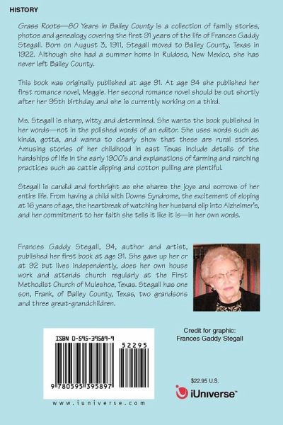 Grass Roots - 80 Years in Bailey County is a collection of family stories, photos and genealogy covering the first 91 years of the life of Frances Gaddy Stegall. Born on August 3, 1911, Stegall moved to Bailey County, Texas in 1922. Although she had a summer home in Ruidoso, New Mexico, she has never left Bailey County. This book was originally published at age 91. At age 94 she published her first romance novel, Meggie. Her second romance novel should be out shortly after her 95th birthday and she is currently working on a third. Ms. Stegall is sharp, witty and determined. She wants the book published in her words - not in the polished words of an editor. She uses words such as kinda, gotta, and wanna to clearly show that these are rural stories. Amusing stories of her childhood in east Texas include details of the hardships of life in the early 1900's and explanations of farming and ranching practices such as cattle dipping and cotton pulling are plentiful. Stegall is candid and forthright as she shares the joys and sorrows of her entire life. From having a child with Downs Syndrome, the excitement of eloping at 16 years of age, the heartbreak of watching her husband slip into Alzheimer's, and her commitment to her faith she tells it like it is - in her own words.
