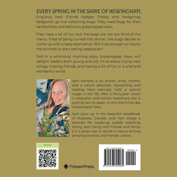 April Kameka is an author, artist, mother, and a nature advocate. Storytelling and reading have eternally held a special magic in her life. After a thirty-year career in allopathic and holistic healthcare she is putting pen to paper in this charming tale, Grasshopper Stew. April grew up in the beautiful woodlands of Muskoka Canada, and now enjoys a lakeside life, kayaking, paddle boarding, biking, and hiking with friends and family. It is a great way to rewild in nature among amazing animals and friendly critters.