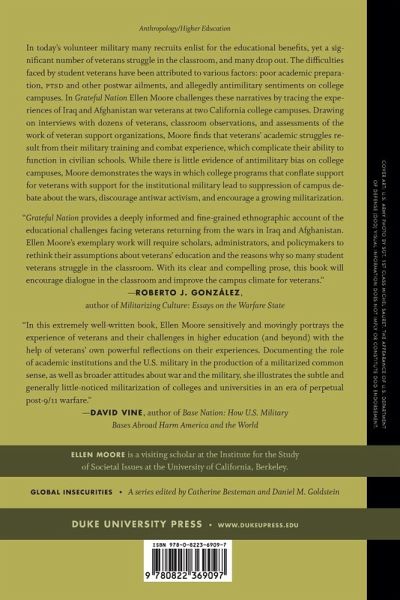 In today's volunteer military many recruits enlist for the educational benefits, yet a significant number of veterans struggle in the classroom, and many drop out. The difficulties faced by student veterans have been attributed to various factors: poor academic preparation, PTSD and other postwar ailments, and allegedly antimilitary sentiments on college campuses. In Grateful Nation Ellen Moore challenges these narratives by tracing the experiences of Iraq and Afghanistan war veterans at two California college campuses. Drawing on interviews with dozens of veterans, classroom observations, and assessments of the work of veteran support organizations, Moore finds that veterans' academic struggles result from their military training and combat experience, which complicate their ability to function in civilian schools. While there is little evidence of antimilitary bias on college campuses, Moore demonstrates the ways in which college programs that conflate support for veterans with support for the institutional military lead to suppression of campus debate about the wars, discourage antiwar activism, and encourage a growing militarization.