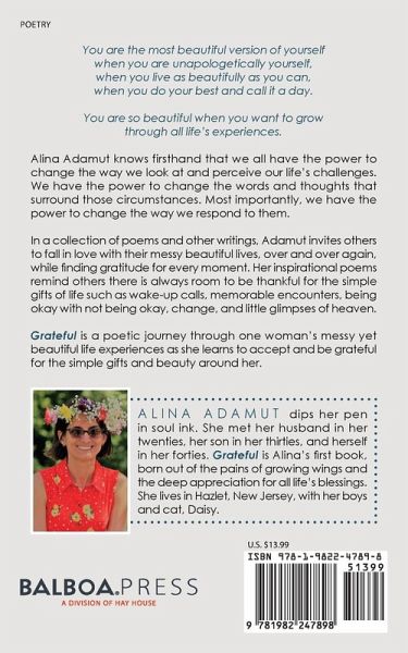 You are the most beautiful version of yourself when you are unapologetically yourself, when you live as beautifully as you can, when you do your best and call it a day. You are so beautiful when you want to grow through all life's experiences. Alina Adamut knows firsthand that we all have the power to change the way we look at and perceive our life's challenges. We have the power to change the words and thoughts that surround those circumstances. Most importantly, we have the power to change the way we respond to them. In a collection of poems and other writings, Adamut invites others to fall in love with their messy beautiful lives, over and over again, while finding gratitude for every moment. Her inspirational poems remind others there is always room to be thankful for the simple gifts of life such as wake-up calls, memorable encounters, being okay with not being okay, change, and little glimpses of heaven. Grateful is a poetic journey through one woman's messy yet beautiful life experiences as she learns to accept and be grateful for the simple gifts and beauty around her.