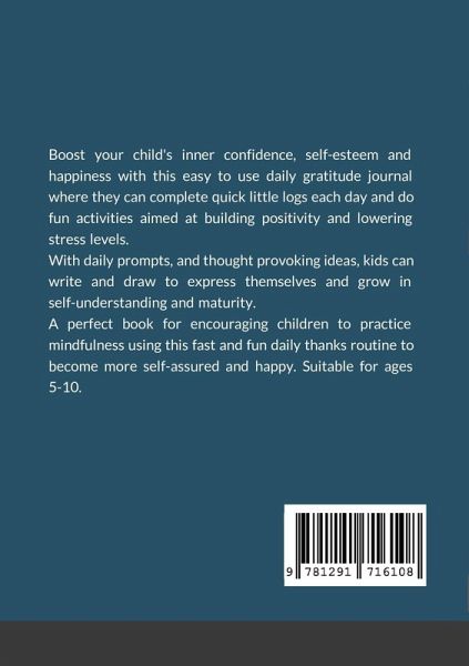 Boost your child's inner confidence, self-esteem and happiness with this easy to use daily gratitude journal where they can complete quick little logs each day and do fun activities aimed at building positivity and lowering stress levels. With daily prompts, and thought provoking ideas, kids can write and draw to express themselves and grow in self-understanding and maturity. A perfect book for encouraging children to practice mindfulness using this fast and fun daily thanks routine to become more self-assured and happy. Parents and children will definitely enjoy reading the thoughts and memories within this little journal in years to come. This little book is A5 sized, making it ideal to fit in your child's bag. Suitable for ages 5-10.