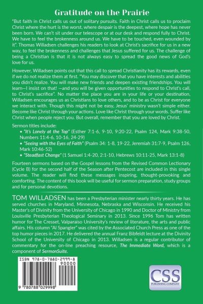 "But faith in Christ calls us out of solitary pursuits. Faith in Christ calls us to proclaim Christ where the hurt is the worst, where despair is the deepest, where hope has never been born. We can’t sit under our telescope or at our desk and respond fully to Christ. We have to feel the brokenness around us. We have to be touched, even wounded by it" (page 15). Thomas Willadsen challenges his readers to look at Christ’s sacrifice for us in a new way, to feel the brokenness and challenges that Jesus suffered for us. The challenge of being a Christian is that it is not always easy to spread the good news of God’s love for us. However, Willadsen points out that this call to spread Christianity has its rewards, even if we do not realize them at first. "You may discover that you have interests and abilities you didn’t realize. You will make new friends and deepen existing friendships. You will learn—I insist on that! —and you will be given opportunities to respond to Christ’s call, to Christ’s sacrifice" (21). No matter the place you are in your life or your destination, Willadsen encourages us as Christians to love others, and to be as Christ for everyone we interact with. Though this might not be easy, Jesus’ ministry wasn’t simple either. Become like Christ through your actions. Love like Christ through your words. Suffer like Christ when people reject you. But overall, remember that you are loved by Christ. Sermon titles include: "It’s Lonely at the Top" (Esther 7:1-6, 9-10, 9:20-22, Psalm 124, Mark 9:38-50, Numbers 11:4-6, 10-16, 24-29) "Seeing with the Eyes of Faith" (Psalm 34: 1-8, 19-22, Jeremiah 31:7-9, Psalm 126, Mark 10:46-52) "Steadfast Change" (1 Samuel 1:4-20, 2:1-10, Hebrews 10:11-25, Mark 13:1-8) Fourteen sermons based on the Gospel lessons from the Revised Common Lectionary (Cycle B) for the second half of the season after Pentecost are included in this single volume. The reader will find these messages inspiring, thought-provoking and comforting. The content of this book will be useful for sermon preparation, study groups and for personal devotions.