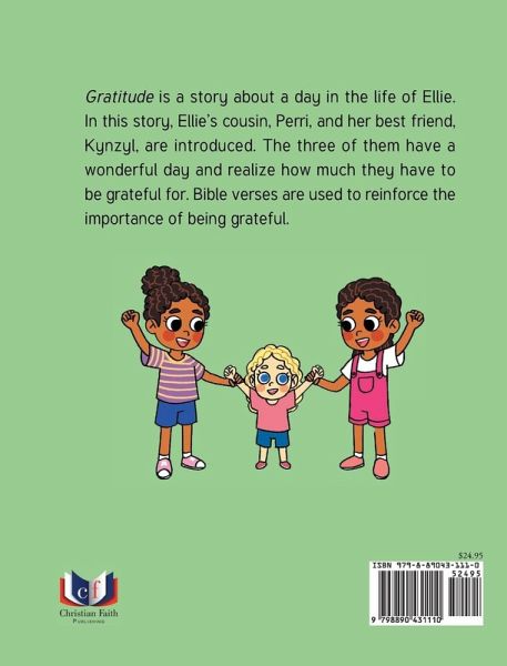 Gratitude is a story about a day in the life of Ellie. In this story, Ellie's cousin, Perri, and her best friend, Kynzyl, are introduced. The three of them have a wonderful day and realize how much they have to be grateful for. Bible verses are used to reinforce the importance of being grateful.