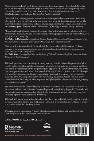 Gratuitous Angst in White America presents a new criminological theory that explains the racialized experiences of white people. Unlike orthodox traditions that assume whiteness as normative or progressive traditions that center the experiences of the marginalized and oppressed, the theory of whiteness and crime flips those perspectives and turns a lens toward white people's lived experiences and the ideologies of whiteness. The theory of whiteness and crime answers two overarching questions: How does being white impact one's likelihood of engaging in deviant, criminal, and/or violent behaviors? And, why are white people treated differently than other racial and ethnic groups by the criminal legal system? Through the application of a critical whiteness perspective to criminology, the theory of whiteness and crime is an intersectional and integrated framework that explains within (and between) group differences in negative behaviors and entanglements with the criminal legal system.