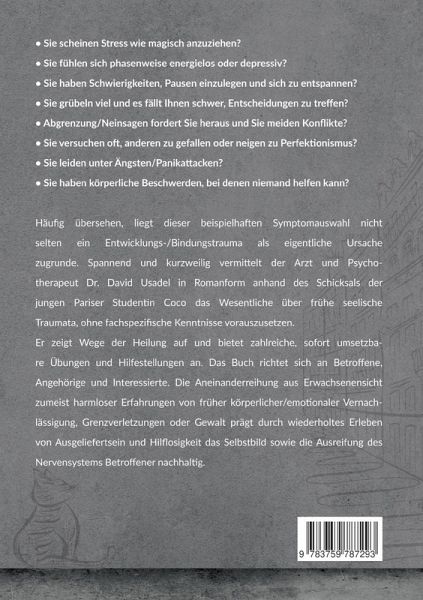 Alles Wichtige zum Thema Entwicklungstrauma/Bindungstrauma! Entsprechend seinem Debut-Roman "Die Ordnung der Schmetterlinge", nutzt der Arzt und Psychotherapeut Dr. David Usadel erneut das Konzept des informativen Romans. Auf unterhaltsame Weise vermittelt er fundiertes psychologisches Wissen, ohne Vorkenntnisse beim Leser vorauszusetzen. Dabei bietet er zahlreiche Übungen und Tipps zur sofortigen Umsetzung im Alltag an und zeigt anhand der Hauptfigur Coco beispielhaft Wege der Heilung auf. Das Buch richtet sich an Betroffene, Angehörige sowie Interessierte gleichermaßen und garantiert neben umfassendem Informationsgehalt Spannung bis zur letzten Seite. Es baut auf dem Roman "Die Ordnung der Schmetterlinge" auf, ohne diesen jedoch vorauszusetzen. Die Pariser Psychologiestudentin Coco leidet zunehmend unter Panikattacken. Nach zwei frustrierenden Therapieversuchen gerät sie schließlich an den junggebliebenen Psychotherapeuten Jacques, durch den sie erstmals vom Phänomen des Entwicklungs-/Bindungstraumas und der damit einhergehenden Störung der Selbstregulation erfährt. Gemeinsam erkunden sie, wie Cocos Hochsensibilität damit zusammenhängt und was sie tun kann, um ihrem Alltag mehr Leichtigkeit und Lebensfreude abzugewinnen. Mithilfe der körperorientierten Traumatherapie findet Coco nach und nach den Weg in ein unbeschwerteres Leben und deckt dabei erschütternde Details ihrer bis dahin weitgehend nebelhaften eigenen Vergangenheit auf.