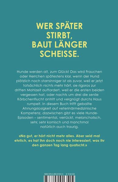 Hunde werden alt, zum Glück! Das wird Frauchen oder Herrchen spätestens klar, wenn der Hund plötzlich noch starrsinniger ist als zuvor, weil er jetzt tatsächlich nichts mehr hört, sie rigoros zur dritten Mahlzeit auffordert, weil er die ersten beiden vergessen hat, oder nachts um drei die senile Körbchenflucht antritt und vergnügt durchs Haus rumpelt. Dieses Buch lässt sie nicht allein und erinnert sie im gleichen Moment daran, wie ihre alten Hunde jung waren, an all die schönen, schrägen, wunderbaren, nervigen Augenblicke mit ihnen, und was man alles veranstaltet, um die Sturköpfe auf Kurs zu halten.