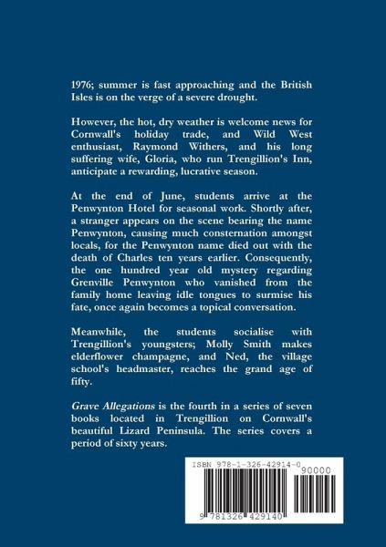 1976; summer is fast approaching and the British Isles is on the verge of a severe drought. However, the hot, dry weather is welcome news for Cornwall's holiday trade, and Wild West enthusiast, Raymond Withers, and his long suffering wife, Gloria, who run Trengillion's Inn, anticipate a lucrative season. At the end of June, a stranger appears on the scene bearing the name Penwynton, causing consternation amongst locals, for the Penwynton name died out with the death of Charles ten years earlier. Consequently, the hundred year old mystery regarding Grenville Penwynton who vanished from the family home once again becomes a topical conversation. Meanwhile, the newly arrived students socialise with Trengillion's youngsters; Molly Smith makes elderflower champagne, and Ned, the village school's headmaster, reaches the grand age of fifty. Grave Allegations is the fourth in a series of seven books located in Trengillion on Cornwall's beautiful Lizard Peninsula. The series covers a period of sixty years.