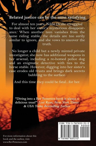 Now a USA Today Bestseller! BELATED JUSTICE CAN BE THE MOST SATISFYING. For almost ten years, Nikki Drake struggled to deal with her sister's mysterious disappearance. When another teen vanishes from the same riding stable, the details are too eerily similar to ignore, and she vows to uncover the truth. No longer a child but a newly minted private investigator, she now has additional weapons in her arsenal, including a re-homed police dog and an enigmatic detective with ties to the horse stable. However, digging into her sister's case erodes old trusts and brings dark secrets bubbling to the surface. And this time they could be fatal...for her.