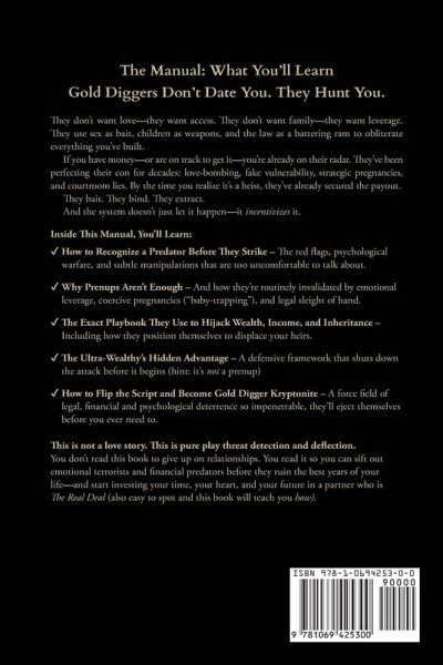 Grave Robbers and Gold Diggers - Full Book Description Gold Diggers Don't Date You. They Hunt You. They don't want love-they want access. They don't want family-they want leverage. They use sex as bait, children as weapons, and the law as a battering ram to obliterate everything you've built. If you have money-or are on track to get it-you're already on their radar. They've been perfecting their con for decades: love-bombing, fake vulnerability, strategic pregnancies, and courtroom lies. By the time you realize it's a heist, they've already secured the payout. They bait. They bind. They extract. And the system doesn't just let it happen-it incentivizes it. Inside This Manual, You'll Learn: ¿ How to Recognize a Predator Before They Strike - Spot the red flags, psychological warfare tactics, and subtle manipulations gold diggers use to trap high earners. ¿ Why Prenups Aren't Enough - Understand how "baby-trapping," emotional leverage, and legal games routinely invalidate prenups. ¿ The Playbook They Use to Hijack Wealth - Discover how financial predators position themselves to siphon assets and displace heirs. ¿ The Ultra-Wealthy's Hidden Advantage - Learn about asset protection strategies like the Family First Trust(TM), not just prenups. ¿ How to Become Gold Digger Kryptonite - Build a legal, financial, and psychological defense to protect yourself from financial exploitation. This is not a love story. This is pure threat detection and deflection. You don't read this book to give up on relationships. You read it to sift out emotional terrorists and financial predators-before they ruin the best years of your life-and start investing your heart, your time, and your future in a partner who is The Real Deal. Protect Your Wealth. Protect Your Future. In a world where financial exploitation is incentivized, Grave Robbers and Gold Diggers is the essential guide to wealth protection, divorce defense, financial self-defense, and relationship survival. It includes battle-tested strategies used by the ultra-wealthy-and an exclusive 20% reader discount on the Family First Trust(TM), the gold standard in asset protection. Protect yourself before the hunt begins. Read the manual. Become untouchable.