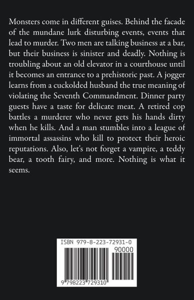 Monsters come in different guises. Behind the facade of the mundane lurk disturbing events, events that lead to murder. Two men are talking business at a bar, but their business is sinister and deadly. Nothing is troubling about an old elevator in a courthouse until it becomes an entrance to a prehistoric past. A jogger learns from a cuckolded husband the true meaning of violating the Seventh Commandment. Dinner party guests have a taste for delicate meat. A retired cop battles a murderer who never gets his hands dirty when he kills. And a man stumbles into a league of immortal assassins, who kill to protect their heroic reputations. Also, let's not forget a vampire, a teddy bear, a tooth fairy, and more. Nothing is what it seems.