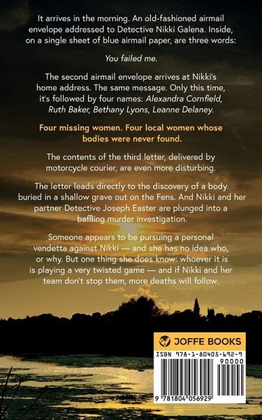 It arrives in the morning. An old-fashioned airmail envelope addressed to Detective Nikki Galena. Inside, on a single sheet of blue airmail paper, are three words: You failed me. The second airmail envelope arrives at Nikki's home address. The same message. Only this time, it's followed by four names: Alexandra Cornfield, Ruth Baker, Bethany Lyons, Leanne Delaney. Four missing women. Four local women whose bodies were never found. The contents of the third letter, delivered by motorcycle courier, are even more disturbing. The letter leads directly to the discovery of a body buried in a shallow grave out on the Fens. And Nikki and her partner Detective Joseph Easter are plunged into a baffling murder investigation. Someone appears to be pursuing a personal vendetta against Nikki - and she has no idea who, or why. But one thing she does know: whoever it is is playing a very twisted game - and if Nikki and her team don't stop them, more deaths will follow.