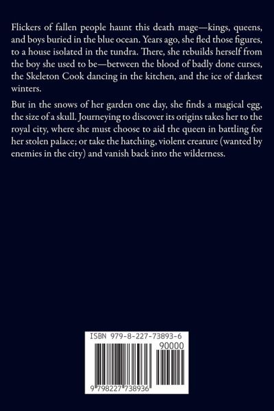 Flickers of fallen people haunt this death mage-kings, queens, and boys buried in the blue ocean. Years ago, she fled those figures, to a house isolated in the tundra. There, she rebuilds herself from the boy she used to be-between the blood of badly done curses, the Skeleton Cook dancing in the kitchen, and the ice of darkest winters. But in the snows of her garden one day, she finds a magical egg, the size of a skull. Journeying to discover its origins takes her to the royal city, where she must choose to aid the queen in battling for her stolen palace; or take the hatching, violent creature (wanted by enemies in the city) and vanish back into the wilderness.