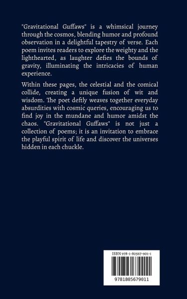 "Gravitational Guffaws" is a whimsical journey through the cosmos, blending humor and profound observation in a delightful tapestry of verse. Each poem invites readers to explore the weighty and the lighthearted, as laughter defies the bounds of gravity, illuminating the intricacies of human experience. Within these pages, the celestial and the comical collide, creating a unique fusion of wit and wisdom. The poet deftly weaves together everyday absurdities with cosmic queries, encouraging us to find joy in the mundane and humor amidst the chaos. "Gravitational Guffaws" is not just a collection of poems; it is an invitation to embrace the playful spirit of life and discover the universes hidden in each chuckle.