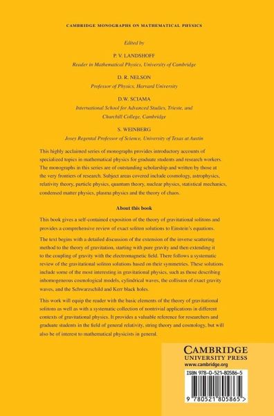 This 2001 book gives a self-contained exposition of the theory of gravitational solitons and provides a comprehensive review of exact soliton solutions to Einstein's equations. The text begins with a detailed discussion of the extension of the Inverse Scattering Method to the theory of gravitation, starting with pure gravity and then extending it to the coupling of gravity with the electromagnetic field. There follows a systematic review of the gravitational soliton solutions based on their symmetries. These solutions include some of the most interesting in gravitational physics such as those describing inhomogeneous cosmological models, cylindrical waves, the collision of exact gravity waves, and the Schwarzschild and Kerr black holes. A valuable reference for researchers and graduate students in the fields of general relativity, string theory and cosmology, this book will also be of interest to mathematical physicists in general.