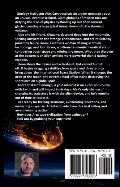 Giant globules of molten rock are defying the laws of physics by floating up out of an ancient glacier in this science fiction mystery. They create a huge spiral tunnel down into a dormant volcano, and Geophysics instructor Alex Cave and his friend O'Conna descend deep into the mountain to discover the cause. What they find is more powerful than a nuclear weapon. Janice Sloan, a ruthless woman dealing in stolen technology, manages to steal the device and takes it into the Nevada desert, but she has no idea what she's doing, and when she turns it on, birds start slamming into the ground around her. She can't turn it off and abandons the device, and it begins dragging satellites from space and threatens to bring down the International Space Station. When it changes the orbit of the moon, the extreme tidal affect begins destroying shorelines on a global scale. Alex and his team think they can fix the problem, but they need to find the device to do it, and Sloan holds it for ransom. The adventure doesn't end when a huge gold asteroid is on a collision course with Earth, and will impact in six days. His only chance of changing its trajectory is with the device, and he is running out of time to find it. A fantastic ride, with thrilling scenarios, exhilarating situations, and nail-biting suspense, by this bestselling and award-winning author. How does Alex save civilization from extinction? Find out by grabbing your copy now!