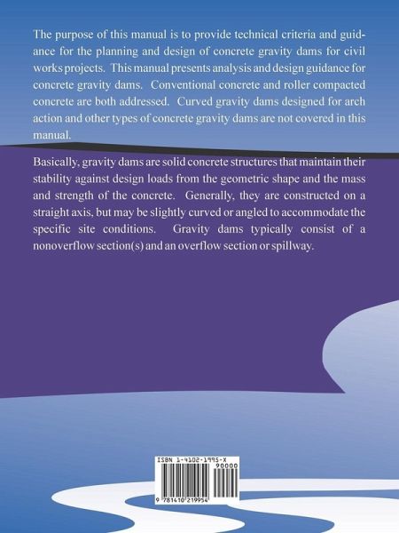The purpose of this manual is to provide technical criteria and guidance for the planning and design of concrete gravity dams for civil works projects. This manual presents analysis and design guidance for concrete gravity dams. Conventional concrete and roller compacted concrete are both addressed. Curved gravity dams designed for arch action and other types of concrete gravity dams are not covered in this manual. Basically, gravity dams are solid concrete structures that maintain their stability against design loads from the geometric shape and the mass and strength of the concrete. Generally, they are constructed on a straight axis, but may be slightly curved or angled to accommodate the specific site conditions. Gravity dams typically consist of a nonoverflow section(s) and an overflow section or spillway.