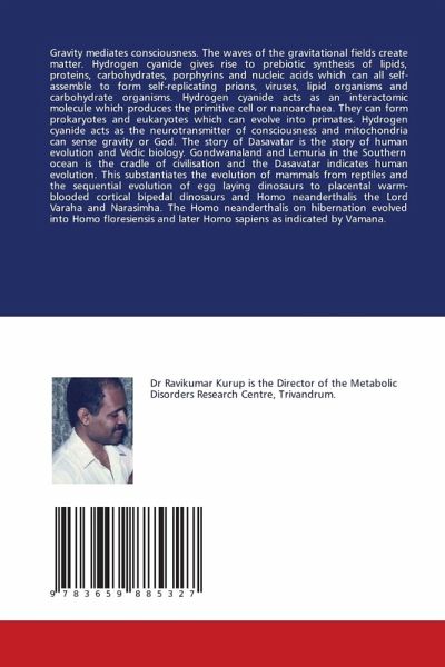 Gravity mediates consciousness. The waves of the gravitational fields create matter. Hydrogen cyanide gives rise to prebiotic synthesis of lipids, proteins, carbohydrates, porphyrins and nucleic acids which can all self-assemble to form self-replicating prions, viruses, lipid organisms and carbohydrate organisms. Hydrogen cyanide acts as an interactomic molecule which produces the primitive cell or nanoarchaea. They can form prokaryotes and eukaryotes which can evolve into primates. Hydrogen cyanide acts as the neurotransmitter of consciousness and mitochondria can sense gravity or God. The story of Dasavatar is the story of human evolution and Vedic biology. Gondwanaland and Lemuria in the Southern ocean is the cradle of civilisation and the Dasavatar indicates human evolution. This substantiates the evolution of mammals from reptiles and the sequential evolution of egg laying dinosaurs to placental warm-blooded cortical bipedal dinosaurs and Homo neanderthalis the Lord Varaha and Narasimha. The Homo neanderthalis on hibernation evolved into Homo floresiensis and later Homo sapiens as indicated by Vamana.