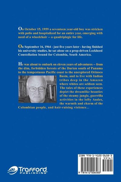 On October 15, 1959 a seventeen-year-old boy was stricken with polio and hospitalized for an entire year, emerging with need of a wheelchair -- a quadriplegic for life. On September 16, 1964, less than five years later, having finished his university studies, he sat alone on a prop-driven Constellation bound for Colombia, South America. He was about to embark on eleven years of adventures -- from the dim, forbidden forests of the Darien south of Panama to the tempestuous Pacific coast to the unexplored Orinoco Basin, and to live with Indian tribes deep in the Amazon who had rarely seen whites. The tales of these experiences depict the dreamlike beauties of the steamy jungle, guerrilla activities in the lofty Andes, the warmth and charm of the Colombian people, and hair-raising violence...