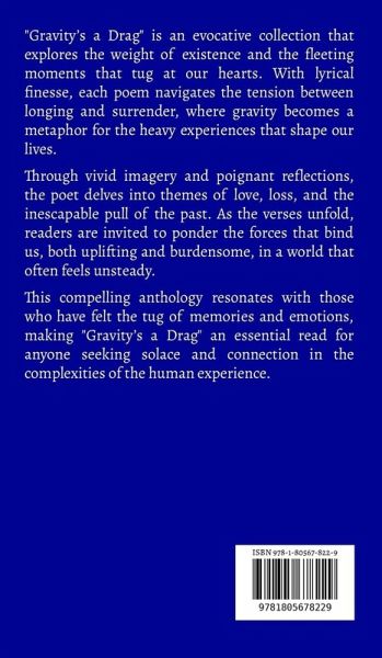 "Gravity's a Drag" is an evocative collection that explores the weight of existence and the fleeting moments that tug at our hearts. With lyrical finesse, each poem navigates the tension between longing and surrender, where gravity becomes a metaphor for the heavy experiences that shape our lives. Through vivid imagery and poignant reflections, the poet delves into themes of love, loss, and the inescapable pull of the past. As the verses unfold, readers are invited to ponder the forces that bind us, both uplifting and burdensome, in a world that often feels unsteady. This compelling anthology resonates with those who have felt the tug of memories and emotions, making "Gravity's a Drag" an essential read for anyone seeking solace and connection in the complexities of the human experience.