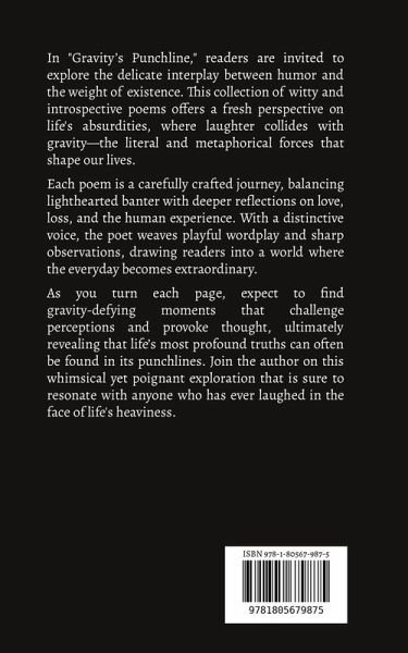 In "Gravity's Punchline," readers are invited to explore the delicate interplay between humor and the weight of existence. This collection of witty and introspective poems offers a fresh perspective on life's absurdities, where laughter collides with gravity-the literal and metaphorical forces that shape our lives. Each poem is a carefully crafted journey, balancing lighthearted banter with deeper reflections on love, loss, and the human experience. With a distinctive voice, the poet weaves playful wordplay and sharp observations, drawing readers into a world where the everyday becomes extraordinary. As you turn each page, expect to find gravity-defying moments that challenge perceptions and provoke thought, ultimately revealing that life's most profound truths can often be found in its punchlines. Join the author on this whimsical yet poignant exploration that is sure to resonate with anyone who has ever laughed in the face of life's heaviness.