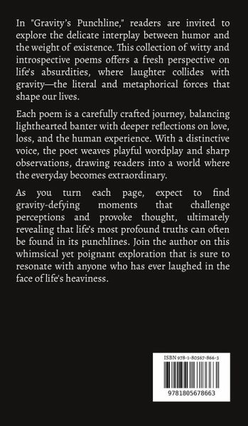 In "Gravity's Punchline," readers are invited to explore the delicate interplay between humor and the weight of existence. This collection of witty and introspective poems offers a fresh perspective on life's absurdities, where laughter collides with gravity-the literal and metaphorical forces that shape our lives. Each poem is a carefully crafted journey, balancing lighthearted banter with deeper reflections on love, loss, and the human experience. With a distinctive voice, the poet weaves playful wordplay and sharp observations, drawing readers into a world where the everyday becomes extraordinary. As you turn each page, expect to find gravity-defying moments that challenge perceptions and provoke thought, ultimately revealing that life's most profound truths can often be found in its punchlines. Join the author on this whimsical yet poignant exploration that is sure to resonate with anyone who has ever laughed in the face of life's heaviness.