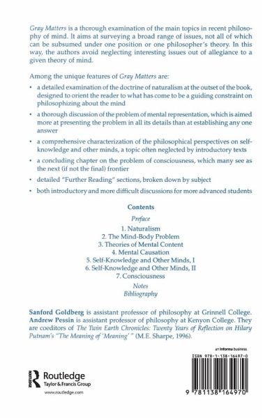 Gray Matters is a thorough examination of the main topics in recent philosophy of mind. It aims at surveying a broad range of issues, not all of which can be subsumed under one position or one philosopher's theory. In this way, the authors avoid neglecting interesting issues out of allegiance to a given theory of mind.
