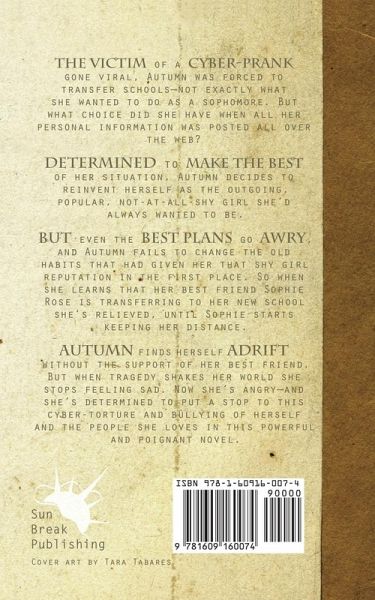The victim of a cyber-prank gone viral, Autumn was forced to transfer schools¿not exactly what she wanted to do as a sophomore. But what choice did she have when all her personal information was posted all over the web? When threatening comments started to trickle in, the police said her only chance to avoid stalkers was to move schools and start over. Determined to make the best of her situation, Autumn realized that she had been given an opportunity to reinvent herself; to become the outgoing, popular, not-at-all-shy girl she'd always wanted to be. But even the best plans go awry. As soon as Autumn arrives at her new school, she meets Maurice¿a bully of monumental proportions who makes life miserable for everyone. Things seem to be looking up when Autumn learns that her best friend Sophie Rose is transferring to her new school, toöbut then Sophie starts keeping her distance. Bullied at school and online, adrift without the support of her best friend, Autumn believes she failed miserably at changing the old habits that had given her that shy girl reputation in the first place. Not only could she not move from reserved to rambunctious, she couldn't even get to normal. But when a tragedy shakes Autumn's world, she stops feeling sad about what happened to her. Now she's angry¿and she's determined to put a stop to this cyber-torture and bullying of herself and the people she loves in this powerful and poignant novel.