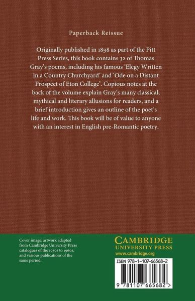 Originally published in 1898 as part of the Pitt Press Series, this book contains 32 of Thomas Gray's poems, including his famous 'Elegy Written in a Country Churchyard' and 'Ode on a Distant Prospect of Eton College'. Copious notes at the back of the volume explain Gray's many classical, mythical and literary allusions for readers, and a brief introduction gives an outline of the poet's life and work. This book will be of value to anyone with an interest in English pre-Romantic poetry.