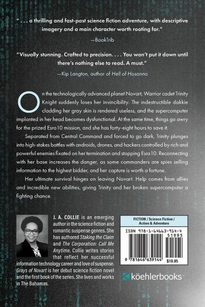 On the technologically advanced planet Novart, Warrior cadet Trinity Knight suddenly loses her invincibility. The indestructible dakkie cladding her gray skin is rendered useless, and the supercomputer implanted in her head becomes dysfunctional. At the same time, things go awry for the prized Esra10 mission, and she has forty-eight hours to save it. Separated from Central Command and forced to go dark, Trinity plunges into high-stakes battles with androids, drones, and hackers controlled by rich and powerful enemies fixated on her termination and stopping Esra10. Reconnecting with her base increases the danger, as some commanders are spies selling information to the highest bidder, and her capture is worth a fortune. Her ultimate survival hinges on leaving Novart. Help comes from allies and incredible new abilities, giving Trinity and her broken supercomputer a fighting chance.