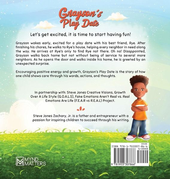 Let's get excited, it is time to start having fun! Grayson wakes early, excited for a play date with his best friend, Rye. After finishing his chores, he walks to Rye's house, helping every neighbor in need along the way. He arrives at Rye's only to find Rye not there. Oh no! Disappointed, Grayson walks back home but not without being of service to several more neighbors. As he opens the door and walks inside his home, he is greeted by an unexpected surprise. Encouraging positive energy and growth, Grayson's Play Date is the story of how one child shows care through his words, actions, and thoughts. In partnership with: Steve Jones Creative Visions, Growth Over A Life Style (G.O.A.L.S), Fake Emotions Aren't Real vs. Real Emotions Are Life (F.E.A.R vs R.E.A.L) Project.