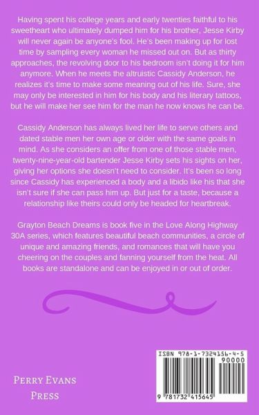 Being with him would be too reckless. But maybe just this once... ¿Having spent his college years and early twenties faithful to his sweetheart who ultimately dumped him for his brother, Jesse Kirby will never again be anyone's fool. He's been making up for lost time by sampling every woman he missed out on. But as thirty approaches, the revolving door to his bedroom isn't doing it for him anymore. When he meets the altruistic Cassidy Anderson, he realizes it's time to make some meaning out of his life. Sure, she may only be interested in him for his body and his literary tattoos, but he will make her see him for the man he now knows he can be. Cassidy Anderson has always lived her life to serve others and dated stable men her own age or older with the same goals in mind. As she considers an offer from one of those stable men, twenty-nine-year-old bartender Jesse Kirby sets his sights on her, giving her options she doesn't need to consider. It's been so long since Cassidy has experienced a body and a libido like his that she isn't sure if she can pass him up. But just for a taste, because a relationship like theirs could only be headed for heartbreak. ¿¿Grayton Beach Dreams is book five in the Love Along Highway 30A series, which features beautiful beach communities, a circle of unique and amazing friends, and romances that will have you cheering on the couples and fanning yourself from the heat. All books are standalone and can be enjoyed in or out of order.