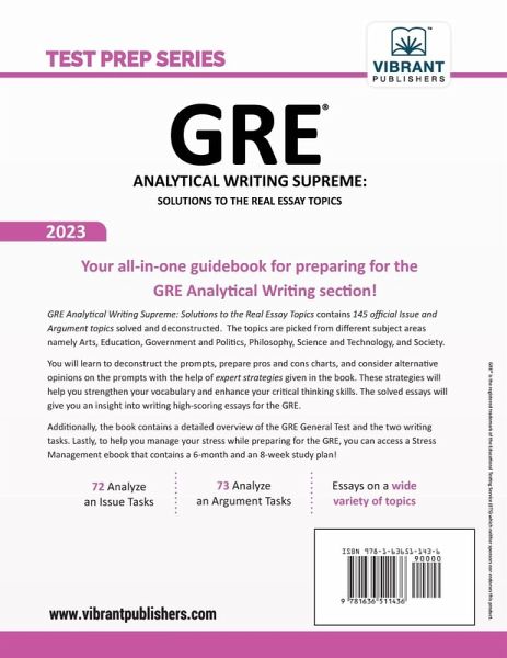 Find everything that you need to know about writing GRE-compliant essays in GRE Analytical Writing Supreme: Solutions to Real Essay Topics! This book includes: 145 Issue and Argument Tasks Expert Tips and Strategies Scoring Guide Overview of the GRE (updated after Covid-19) Overview of Analyze an Issue and Analyze an Argument Tasks Printable Answer Sheets (online) GRE Stress Management book (online) 6-month and 8-week study plans (online) To get a comprehensive practice of the Analytical Writing section of the GRE, this book is all you need. The book is filled with official 72 Analyze an Issue and 73 Analyze an Argument prompts with sample essays. The sample essays, written on a wide variety of topics, show what high-scoring essays in the GRE look like. Before the sample essays, elaborate strategies for deconstructing the prompts, weighing their pros and cons to form an opinion, and considering alternative opinions are also given. These strategies will enhance your critical thinking skills and give your brain a healthy workout. Apart from this, the book contains all the information about the GRE General Test and the two tasks. A detailed scoring guide containing information on the areas checked in the essays is also given. Lastly, tips and tricks are also provided to practice writing your own essays on printable answer sheets provided online. Additional Online Resources You can access a GRE Stress Management ebook that is available online. This book is filled with tips, strategies, and study plans to help you crack the GRE! About Test Prep Series The focus of the Test Prep Series is to make test preparation streamlined and fruitful for competitive exam aspirants. Students preparing for the entrance exams now have access to the most comprehensive series of prep guides for GRE, GMAT, and SAT preparation. All the books in this series are thoroughly researched, frequently updated, and packed with relevant content that has been prepared by authors with more than a decade of experience in the field.
