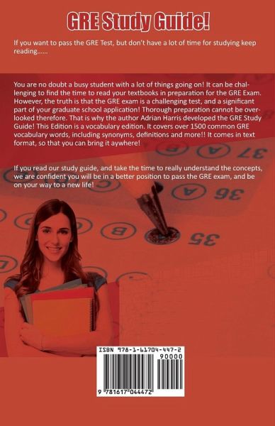 If you want to pass the GRE Test, but don't have a lot of time for studying keep reading...... You are no doubt a busy student with a lot of things going on! It can be challenging to find the time to read your textbooks in preparation for the GRE Exam. However, the truth is that the GRE exam is a challenging test, and a significant part of your graduate school application! Thorough preparation cannot be overlooked therefore. That is why the author Adrian Harris developed the GRE Study Guide! This Edition is a vocabulary edition. It covers over 1500 common gre vocabulary words, including synonyms, definitions and more!! It comes in text format, so that you can bring it aywhere! If you read our study guide, and take the time to really understand the concepts, we are confident you will be in a better position to pass the gre exam, and be on your way to a new life!