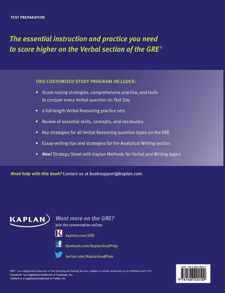 Hundreds of realistic practice questions and exercises to prepare you for the verbal portion of the GRE Kaplan's GRE Verbal Workbook, 9th Edition, comprehensively addresses the Verbal Reasoning and Writing sections of the GRE Revised General Test. This workbook is a highly effective way to prepare for the verbal section of the GRE. For the most essential information on the GRE from the leader in GRE preparation, prep with GRE Verbal Workbook. Kaplan gives you everything you need to boost your Verbal score on the GRE, including the most effective strategies, comprehensive practice, and tools to conquer every question on Test Day. This customized study program includes: 6 full-length Verbal Reasoning practice sets Diagnostic tool for even more targeted Verbal practice Review of essential skills and concepts, including vocabulary Key strategies for all Verbal Reasoning question types on the revised GRE Essay-writing tips and strategies for the Analytical Writing section