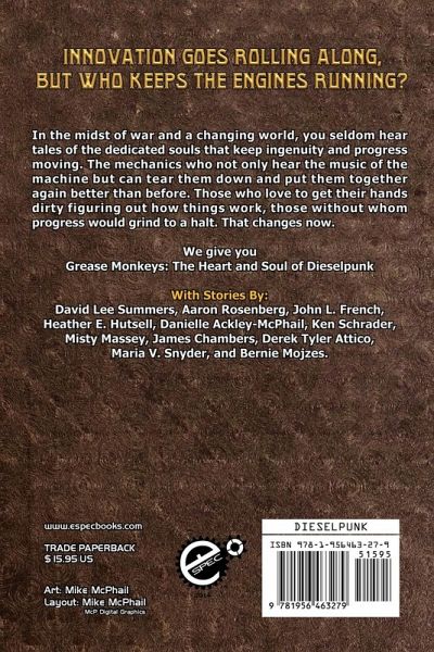 Innovation Goes Rolling Along, But Who Keeps the Engines Running? In the midst of war and a changing world, you seldom hear tales of the dedicated souls that keep ingenuity and progress moving. The mechanics who not only hear the music of the machine but can tear them down and put them together again better than before. Those who love to get their hands dirty figuring out how things work, those without whom progress would grind to a halt. That changes now. We give you Grease Monkeys: The Heart and Soul of Dieselpunkwith stories by: David Lee Summers, Aaron Rosenberg, John L. French, Heather E. Hutsell, Danielle Ackley-McPhail, Ken Schrader, Misty Massey, James Chambers, Derek Tyler Attico, Maria V. Snyder, and Bernie Mojzes.