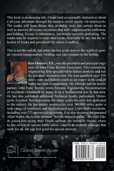 This book is an amusing tale, I hope (and occasionally instructive) about a 60-year adventure through the modern world mostly via motorcycle. The reader will learn things they probably were not curious about as well as answers to cosmic mysteries that were suppressed for millennia, just kidding. Greasy is informative, but mostly curiosity provoking. The reader may be inspired to read other books, hopefully by me, but the selection of books and periodicals by others is endless. This is not the end all, but rather the key to the door to the world of open-air visceral transportation. Nothing else can compare to the feeling.