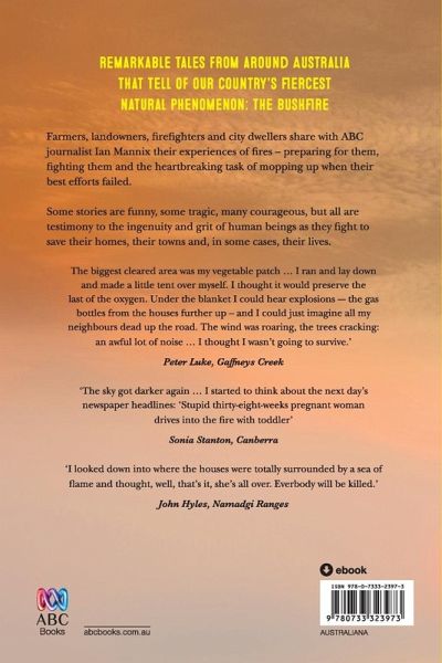 'the biggest cleared area was my vegetable patch ... I ran and lay down and made a little tent over myself. I thought it would preserve the last of the oxygen. Under the blanket I could hear explosions - the gas bottles from the houses further up, and I could just imagine all my neighbours dead up the road. the wind was roaring, the trees cracking: an awful lot of noise ... I thought I wasn't going to survive.' Peter Luke, Gaffneys Creek, Victoria 'the sky got darker again ... I started to think about the next day's newspaper headlines: "Stupid thirty-eight-weeks pregnant woman drives into fire with toddler."' Sonia Stanton, Canberra 'I looked down into where the houses were totally surrounded by a sea of flame and thought, well, that's it, she's all over. Everybody will be killed down there.' John Hyles, Namadgi Ranges GREAt AUStRALIAN BUSHFIRE StORIES is a collection of remarkable tales from all around Australia that tell of our country's fiercest natural phenomenon: the bushfire. Farmers, landowners, firefighters and city dwellers share with ABC journalist Ian Mannix their experiences of fires: preparing for them, fighting them, and the heartbreak task of mopping up when even their best efforts failed. Some stories are funny, some tragic, many courageous, but all are a testimony to the ingenuity and grit of human beings as they fight to save their homes, their towns and, in some cases, their lives.