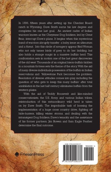 In 1896, fifteen years after setting up the Checker Board ranch in Wyoming, Dave Smith earns his law degree and completes his one last goal. An ancient cadre of Indian warriors known as the Cheyenne Dog Soldiers, led by Great Bear, interrupt Dave's plans. It begins when this mysterious band of warriors abruptly transfer a baby, issue an ultimatum and a threat. Into this circle of savagery appear Bird Woman who not only tames birds of prey to do her bidding, but also holds a strange magic in a massive buffalo herd. This confrontation sets in motion one of the last great discoveries of the old west. Thousands of an original bison-buffalo hidden in a mountain fortress sets the theme of the story. With the aid of many diverse individuals possession of the buffalo in Indian reservations and Yellowstone Park becomes the problem. Resolution of diverse attitudes comes into play, including the question of 'who gets to keep this many buffalo' after total annihilation in the last half century eliminates buffalo from the western plains.. With the aid of Teddy Roosevelt and like-minded conservationists, the U.S. Army, and various Indian tribes, reintroduction of this extraordinary wild herd is taken on by Dave Smith. The improbable task of bossing the implementation of a huge cross country drive, fighting off hide-hunters, killing winter storms, and dealing with the intransigent Dog Soldiers, Dave's tenacity and the assistance of his former partners, Jim Bowen and Sam Eagle Feather determine the final outcome.