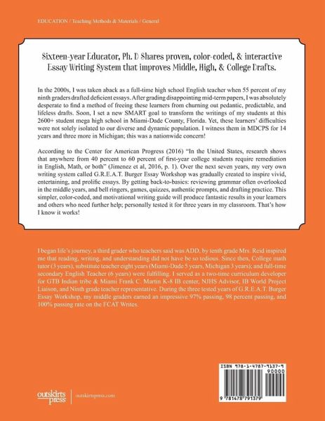 Sixteen-year master educator & Ph. D Stephen C. Simms shares his proven, color-coded, and interactive writing system that improves the essays of Middle, High, and College students! When he began, this secondary English teacher was literally taken aback! His first year felt insurmountable as he dealt with the sobering reality that 55 percent of his ninth graders drafted deficient essays. Dr. Simms was absolutely desperate to devise a method of freeing these learners from churning out predictable, pedantic, and lifeless drafts. Soon, he set a new SMART goal to transform the writings of his pupils at this 2600+ mega high school in the heart of Miami-Dade County, Florida. Yet, their struggles were not solely isolated to that diverse, dynamic population. He knew that weaker essay writing was not only prevalent during his fourteen years of educating in MDCPS, nor two years in Michigan schools; it was a nationwide epidemic! According to the Center for American Progress (2016), "In the United States, research shows that anywhere from 40 percent to 60 percent of first-year college students require remediation in English, Math, or both" (Jimenez et al, 2016, p. 1). It became abundantly clear that students' essay writing skills were not being sufficiently honed between elementary and high school. There had to be a way to bridge the substantial gap. Over the next seven years, Dr. Simms devised his own unique writing system called G.R.E.A.T. Burger Essay Workshop. It was gradually created to inspire vivid, entertaining, and prolific essays. By getting back-to-basics; reviewing grammar, including bell ringers, games, quizzes, authentic prompts, drafting practice; he could transport writers to a higher level of confidence and expression. The teacher sought to serve struggling, ESL, average, and even better writers when he developed G.R.E.A.T--Grammatically correct, Repetition free, Expertly supported, Adjective/Adverb filled, and Transition packed. This simpler, colo