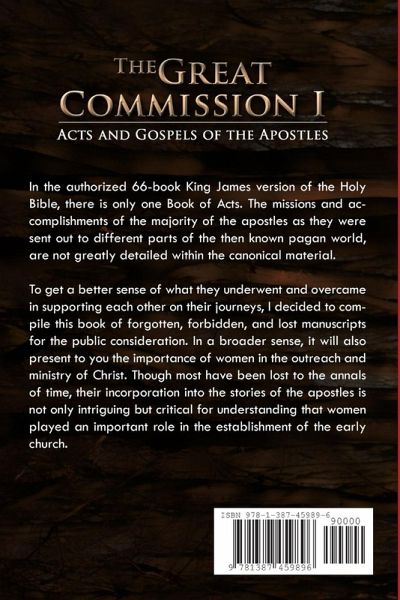 In the authorized 66-book King James version of the Holy Bible, there is only one Book of Acts. The missions and accomplishments of the majority of the apostles as they were sent out to different parts of the then known pagan world, are not greatly detailed within the canonical material. To get a better sense of what they underwent and overcame in supporting each other on their journeys, I decided to compile this book of forgotten, forbidden, and lost manuscripts for the public consideration. In a broader sense, it will also present to you the importance of women in the outreach and ministry…mehr