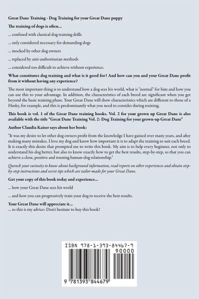 Great Dane Training - Dog Training for your Great Dane puppy The training of dogs is often... ... confused with classical dog training drills ... only considered necessary for demanding dogs ... mocked by other dog owners ... replaced by anti-authoritarian methods ... considered too difficult to achieve without experience. What constitutes dog training and what is it good for? And how can you and your Great Dane profit from it without having any experience? The most important thing is to understand how a dog sees his world, what is "normal" for him and how you can use this to your advantage. In addition, the characteristics of each breed are significant when you get beyond the basic training phase. Your Great Dane will show characteristics which are different to those of a Husky, for example, and this is predominantly what you need to consider during training. This book is vol. 1 of the Great Dane training books. Vol. 2 for your grown up Great Dane is also available with the title "Great Dane Training Vol. 2: Dog Training for your grown-up Great Dane" Author Claudia Kaiser says about her book: "It was my desire to let other dog owners profit from the knowledge I have gained over many years, and after making many mistakes. I love my dog and know how important it is to adapt the training to suit each breed. It is exactly this desire that prompted me to write this book. My aim is to help every beginner, not only to understand his dog better, but also to know exactly how to get the best results, step-by-step, so that you can achieve a close, positive and trusting human-dog relationship." Quench your curiosity to know about background information, read reports on other experiences and obtain step-by-step instructions and secret tips which are tailor-made for your Great Dane. Get your copy of this book today and experience... ... how your Great Dane sees his world ... and how you can progressively train your dog to receive the best results. Your Great Dane will appreciate it... ... so this is my advice: Don't hesitate to buy this book! Content of this book: About the Author Preface What you need to know about your Great Dane Cornerstones of training puppies Before the puppy arrives The first few weeks The first commands Training basic knowledge Special Chapter – The hunting instinct Check list for the start Conclusion