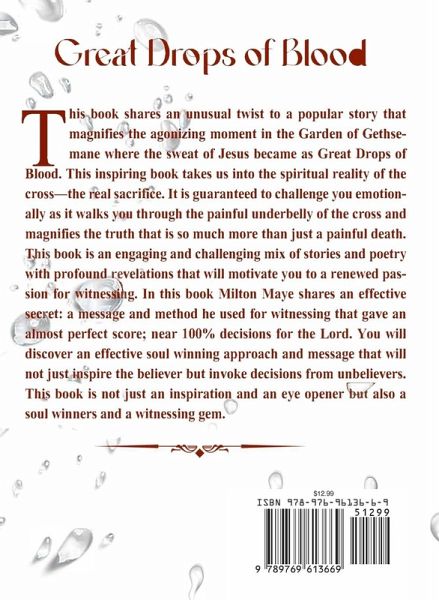 This book shares an unusual twist to a popular story that magnifies the agonizing moment in the Garden of Gethsemane where the sweat of Jesus became as Great Drops of Blood. This inspiring book takes us into the spiritual reality of the cross-the real sacrifice. It is guaranteed to challenge you emotionally as it walks you through the painful underbelly of the cross and magnifies the truth that is so much more than just a painful death. This book is an engaging and challenging mix of stories and poetry with profound revelations that will motivate you to a renewed passion for witnessing. In this book Milton Maye shares an effective secret: a message and method he used for witnessing that gave an almost perfect score; near 100% decisions for the Lord. You will discover an effective soulwinning approach and message that will not just inspire the believer but invoke decisions from unbelievers. This book is not just an inspiration and an eye opener but also a soulwinners and a witnessing gem.