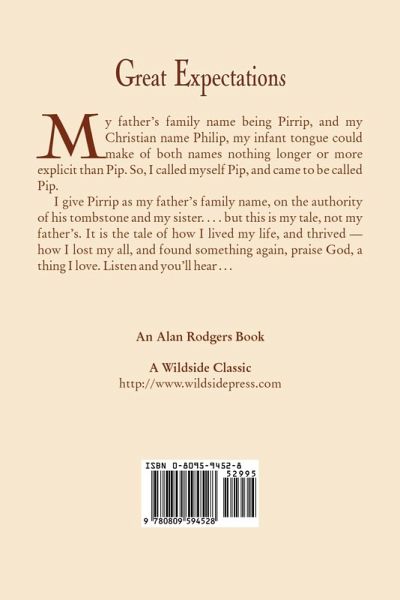My father's family name being Pirrip, and my Christian name Philip, my infant tongue could make of both names nothing longer or more explicit than Pip. So, I called myself Pip, and came to be called Pip. I give Pirrip as my father's family name, on the authority of his tombstone and my sister. . . . but this is my tale, not my father's. It is the tale of how I lived my life, and thrived -- how I lost my all, and found something again, praiise God, a thing I love. Listen and you'dll hear . . .