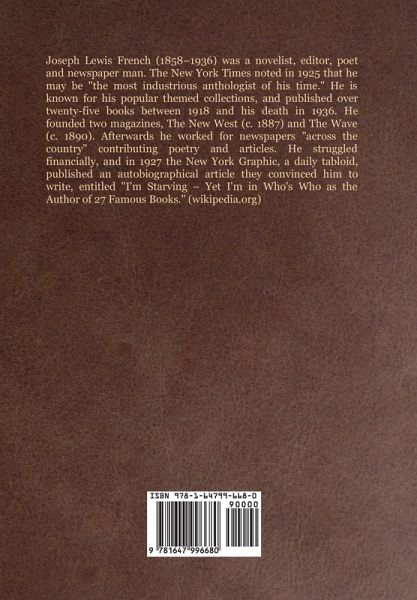 Joseph Lewis French (1858-1936) was a novelist, editor, poet and newspaper man. The New York Times noted in 1925 that he may be "the most industrious anthologist of his time." He is known for his popular themed collections, and published over twenty-five books between 1918 and his death in 1936. He founded two magazines, The New West (c. 1887) and The Wave (c. 1890). Afterwards he worked for newspapers "across the country" contributing poetry and articles. He struggled financially, and in 1927 the New York Graphic, a daily tabloid, published an autobiographical article they convinced him to write, entitled "I'm Starving - Yet I'm in Who's Who as the Author of 27 Famous Books." (wikipedia.org)